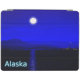Moonrise in the Inside Passage off the coat of Alaska. Mountains in the distance and a fishing boat heads north. Text reading "Alaska" also appears in glowing blue and white.