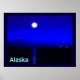 Moonrise in the Inside Passage off the coat of Alaska. Mountains in the distance and a fishing boat heads north. Text reading "Alaska" appears in glowing blue and white.
