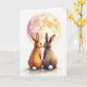 The front design shows two stylized rabbits sitting close together on a simple ground, their bodies angled away while their heads turn back to share a tender, knowing look 🐇. One rabbit is shaded in warm ginger, and the other in deep earthy brown, each with a small fluffy white tail that adds a sweet, affectionate touch. Above them, a large full moon fills the upper area, glowing with soft yellows, gentle pinks, and peachy tones, with faint crater-like textures blended into its surface. The moonlight washes over the pair and creates a light sheen on the ground beneath them, as if they’ve found a quiet spot to sit side by side 🌷. Any greeting text sits near the top, centered beneath the moon’s edge, in a light cream color that stands out without feeling harsh. A smaller line of text can rest near the bottom, also centered, in a muted warm gray that echoes the moonlit scene. The background stays minimal and airy, letting the rabbits’ closeness and the soft night glow carry the story. The moon’s pastel halo fades outward into the open sky above the two rabbits.