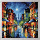 A vibrant cityscape painting capturing the magic of a moonlit night, with reflections shimmering on a wet street.