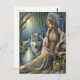 Under the tranquil glow of the moonlight, a serene woman rests by a forest stream, her elegant posture exuding contemplation. Adorned with an ornate headdress and finery that echoes the forests own intricate patterns, she shares a silent communion with a majestic grey wolf. In the background, the shadows of wolves meld with the twilight-draped trees, creating a harmonious fusion of wild spirit and peaceful reverie.