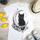 This enchanting illustration features a black cat perched gracefully atop a crescent moon, surrounded by swirling clouds and scattered stars. Rendered in vintage ink style with fine cross-hatching and delicate linework, the design evokes a dreamy, witchy vibe perfect for Halloween or year-round magic. The cat’s wide eyes and curled tail add a touch of mystery and charm, making it ideal for stickers, apparel, or celestial-themed merch.
