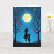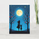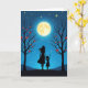 Designed with a peaceful night scene, the card shows a black silhouette of a parent and child holding hands on a softly curved grassy hill, leaning close as they look up together ❤️. The child’s free arm lifts toward the sky, as if pointing out something special, adding a sweet, shared moment between them. Above and slightly centered sits a large glowing full moon, washing the deep indigo sky with a gentle light. Scattered stars dot the background, giving the space a calm, dreamy feel. On both sides of the moon stand two tall, leafless trees in dark silhouette, their branches spreading outward like lace. Clinging to those branches are many small red butterflies, creating warm accents against the cool blues and blacks 🌼. A short Mother’s Day message appears near the top in light-colored lettering, with a smaller line of text placed near the bottom in a matching tone. The red butterflies appear in clusters along the upper branches of each tree, framing the moon.