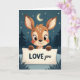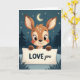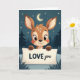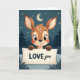 This design shows a sweet young fawn with big, shining eyes, tiny lashes, and rosy cheeks, looking straight at you with a gentle, trusting expression 🥰. Its fur is warm fawn-brown, and you can see small white spots on its forehead that stand out against the darker background. The fawn holds a light parchment-colored banner in its front hooves, as if it’s offering it to someone it cares about. On the banner, the words “LOVE you” are written, with “LOVE” in clear capital letters and “you” in a smooth cursive style, placed right in the center of the card. Behind the fawn is a deep teal-blue night sky with a bright crescent moon and scattered stars overhead. Dark evergreen trees line the horizon, and shadowy leaves in the foreground frame the lower part of the scene. It feels meaningful because the fawn’s calm gaze and the quiet night setting make the message feel sincere and comforting ❤️.