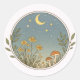 A dreamy circular design featuring a soft night sky with a crescent moon, glowing stars, and a peaceful garden of wildflowers and mushrooms.