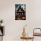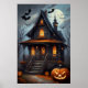 Unveil the spirit of Halloween with a captivating poster. A spook-tacular wooden house takes center stage, shrouded in an eerie ambiance. The bright moon casts an enchanting glow, while bats dance around its rooftop. Carved pumpkins line the front, adding a touch of whimsical fright. This digital artwork captures the essence of Halloween in a classic yet electrifying style.