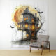 Step into the shadows of this haunted gothic estate, where twisted trees claw at broken shingles and every glowing turret whispers of restless spirits. Beneath a jaundiced full moon, bats circle the decaying structure, casting fleeting silhouettes across its eerie façade. The barren ground and skeletal trees frame the house like a forgotten graveyard, amplifying its sinister charm. Perfect for Halloween-themed designs, invitations, or decor that craves a touch of the macabre.