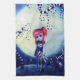 A gothic, doll-like girl with fiery red pigtails stands on a surreal hilltop under a glowing full moon. Dressed in a dark outfit adorned with skulls and clutching a stitched-up bunny, she’s surrounded by whimsical, black-and-white striped tentacles that twist through a star-speckled night sky.