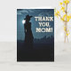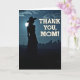 This greeting card shows a deep indigo night sky with a large glowing moon that lights the scene like a soft spotlight ❤️. On the left, a graceful woman’s silhouette stands in profile, wearing a wide-brimmed hat with loose hair falling beneath it and a long skirt that drifts toward the dark, textured ground. The moon sits just behind her, creating a gentle halo around her outline, as if she’s pausing in a quiet moment meant for someone she cares about. Thin, wispy clouds slide across the sky, adding a tender, dreamy layer to the strong light-and-shadow contrast. In the distance, a low, shadowy city skyline stretches along the horizon, hinting at faraway life while she remains calmly alone. On the right side, the message “THANK YOU, MOM!” appears in large, light-colored serif lettering, stacked neatly and standing out against the darker sky 🌼. The words sit to the right of the figure, balanced by the bright moon behind her and the faint city shapes below. The overall palette stays in midnight blues and charcoal tones, with the moon and pale text as the brightest points.