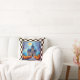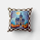 Moonlit Pumpkins Fall Throw Pillow - Charming castle decorated for fall with pretty pumpkins and a warm moon glow. Colors blue, gray, burnt orange, black and white check pattern.