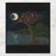 Colorful nature scene. A moonlit river, rolling hills, and a colorful tree with leaves blowing in the breeze.