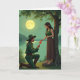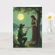 This greeting card shows a moonlit lakeside scene where a man in earthy green clothing and a wide-brim hat kneels in soft grass, reaching up with a single orange flower toward a woman standing barefoot on a weathered tree stump. Her long dark hair falls around her face as she leans slightly forward, meeting his gaze with a quiet, tender look that suggests close friendship or romance. The huge full moon hangs low in the sky, washing the landscape in green-gold light that glints across the still water and fades into distant, tree-covered hills. A thick tree trunk and leafy canopy frame the right side, echoing the surrounding greens and adding a sheltered feeling to the moment 💚. The orange blossom stands out against the cool greens and deep blues, pulling your eye right to their hands as the gift is offered and received. Near the top, “Happy St. Patrick’s Day” appears in light lettering, set clearly against the darker sky, with a small ☘️ accent nearby. The lake’s reflection mirrors the moon’s glow in a soft oval of light, with gentle ripples spreading outward.