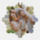 Beautiful snowflake shaped Christmas card and ornament in one printed with your photo in a round frame surrounded by a white snowflake against a moonstone blue background. Add another photo on the back. Light blue and white snowflake shaped happy holidays card and ornament in one, printed with your photos and family name and the year.