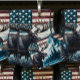 A majestic moose stands by a serene lake, framed by mountains and a backdrop of the American flag, capturing a sense of nature and patriotism.