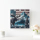 A majestic moose stands by a serene lake, framed by mountains and a backdrop of the American flag, capturing a sense of nature and patriotism.