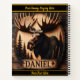 An intricately carved moose emerges from a wooden plaque, surrounded by forest trees, showcasing nature's beauty and craftsmanship.