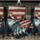 A moose head emerges from a rustic wooden backdrop featuring the American flag, mountains, and pine trees, celebrating nature and patriotism.