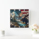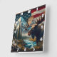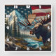 A moose stands by a river, surrounded by forest and mountains, with an American flag backdrop in the distance.