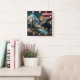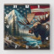 A moose stands by a river, surrounded by forest and mountains, with an American flag backdrop in the distance.