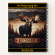 A stunning moose with magnificent antlers stands against a backdrop of sunset and pine trees, embodying wilderness beauty.