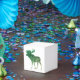 This design is the outline of a moose with a green to beige color gradient and the silhouette of a tree inside.