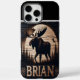 A wooden sign with a silhouette of a moose standing under a full moon, with the name BRIAN carved underneath.