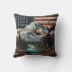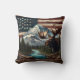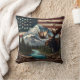 A large moose stands near a river, framed by pine trees and mountains, with a backdrop of the American flag made of wood.
