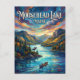 This image captures the lake's enormous scale, with bold, flowing shapes defining the deep blue water and the surrounding forested mountains. A stylized, small boat provides a sense of perspective. The expressive, colorful sky and strong lighting create a powerful, atmospheric impression of this dramatic northern wilderness.