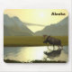 Somewhere in the interior of Alaska a moose strides through a pond on a sunny fall afternoon. As the end of the year approaches the light has taken on the typical yellowish tone that makes everything seem a bit brittle. The sun is dropping down between the mountains in the background. Text reading "Alaska" also appears.