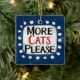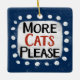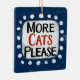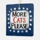 "More Cats Please" is a cute text design in blue with black and red text, along with a white accent shape and white textured whimsical dots surrounding it.