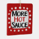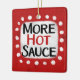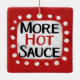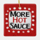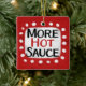 "More Hot Sauce" is a cute text design in red with black and red text, along with a white accent shape and white textured whimsical dots surrounding it.