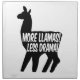 More llamas! Less drama! Black and white design. Comic style text inside a silhouette of a llama.