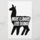 More llamas! Less drama! Black and white design. Comic style text inside a silhouette of a llama.