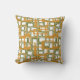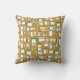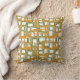 This throw pillow has a mid-century modern design of open rectangles in gold over open rectangles in green.