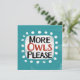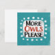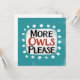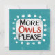 "More Owls Please" is a cute text design in blue with black and red text, along with a white accent shape and white textured whimsical dots surrounding it.