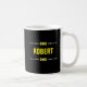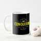 "More Than A Conqueror" Christian typography design badge. Type in emblem style with yellow and black letters states, "I'm more than a conqueror through Christ who loved me." Scripture reference is from Romans 8:37. Back of mug has duplicate design ornaments and area in vertical middle for custom name.