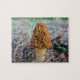 A Morel Spring Mushroom shot close up that's on a Puzzle. That's brown, with green weed's, and brown grass. With a white mushroom stem.