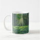 Sunlight filters through tall, dense trees, casting a radiant glow over a lush, green forest floor dotted with delicate white flowers. The serene environment evokes a sense of peace and tranquility.