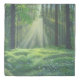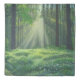 Sunlight filters through tall, dense trees, casting a radiant glow over a lush, green forest floor dotted with delicate white flowers. The serene environment evokes a sense of peace and tranquility.