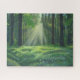 Sunlight filters through tall, dense trees, casting a radiant glow over a lush, green forest floor dotted with delicate white flowers. The serene environment evokes a sense of peace and tranquility.