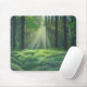 Sunlight filters through tall, dense trees, casting a radiant glow over a lush, green forest floor dotted with delicate white flowers. The serene environment evokes a sense of peace and tranquility.