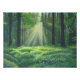 Sunlight filters through tall, dense trees, casting a radiant glow over a lush, green forest floor dotted with delicate white flowers. The serene environment evokes a sense of peace and tranquility.