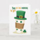This greeting card features a white background with a stylized disposable coffee cup dressed up like a leprechaun, bringing a friendly St. Patrick’s Day mood 💚. The cup is creamy beige with small emerald-green shamrocks scattered across it, and a cozy earthy-brown sleeve wraps around the middle like a warm hug. Sitting on top is a forest-green leprechaun hat with a dark band and a gold buckle, giving the character a jaunty, welcoming look ☘️. The phrase “top OF THE MORNING to ye!” appears near the cup in mixed lettering, with the words shown in green and golden-orange to match the accents. The layout keeps the cup centered, so it feels like it’s greeting you directly, like a pal leaning in over morning coffee. A single larger shamrock rests near the bottom of the design, adding a gentle grounding touch. The hat’s buckle shines in gold against the deep green band, and the shamrocks pop crisply against the creamy cup.