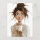 The image depicts a whimsical, exaggerated cartoon-style illustration of a woman with wide, startled eyes, tousled hair in a messy bun, and freckles. She looks disheveled and confused, holding a white coffee mug in both hands while wearing a light robe with a floral pattern. Her expression suggests she’s either shocked or overwhelmed, possibly after just waking up or experiencing a chaotic moment. The exaggerated features, especially her large eyes and thin, expressive face, add a humorous and relatable tone to the scene.