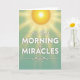 Designed with a glowing sunrise scene, the card shows a bright orb near the top sending warm golden rays downward like a gentle embrace. The background shifts from sunlit gold at the top into calm aquamarine and teal below, creating a smooth gradient that feels like two friends watching the day begin together 🌷. Centered in the middle is a white typographic message, with smaller words like “on this” and “of” placed between larger lines to guide the eye. Those smaller words appear in a flowing, cursive-style lettering, adding a soft, romantic touch next to the large all-caps words “MORNING” and “MIRACLES.” The white text stands out sharply against the glowing colors, and a faint shadow under each letter gives it a gentle lift from the background. Beneath the message sits a symmetrical white decorative flourish with curled lines and tiny circular accents, like a quiet promise shared between close companions 🐇. At the very bottom, the teal tones deepen slightly behind the flourish while the rays fade into a soft haze.