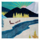 A digital landscape with bright colors and textures showing a musher with a dog sled team and a glowing pink sunrise in shades of blue, gold, cyan, and yellow.