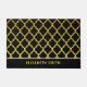 Moroccan arabesque quatrefoil style print in faux gold on solid black. Tones of golden yellow designed to simulate the color, texture and shine of metallic hammered gold or gold leaf. Personalize with your name or message in golden yellow sans font set on a black and gold stripe at the bottom of the product.