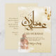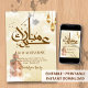 Celebrate Eid with this elegant card featuring the iconic Koutoubia mosque tower under a bright sky with flying birds and golden lanterns. Perfect for a traditional yet modern touch.