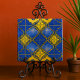 Ornamental decorative ceramic tile featuring a denim lapis blue and deep golden yellow ochre quatrefoil pattern inspired by Moroccan art and design. A beautiful accent piece for any elegant setting, it looks great displayed on an easel stand or framed as art, or as the base for a glass vase. Can be worked into a kitchen backsplash, as a border accent, or in the bathroom. Perfect for those who love Moroccan style, maximalist decor, or a Mediterranean vibe.