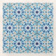 A symmetrical Moroccan pattern consisting of a mosaic of blue shades.